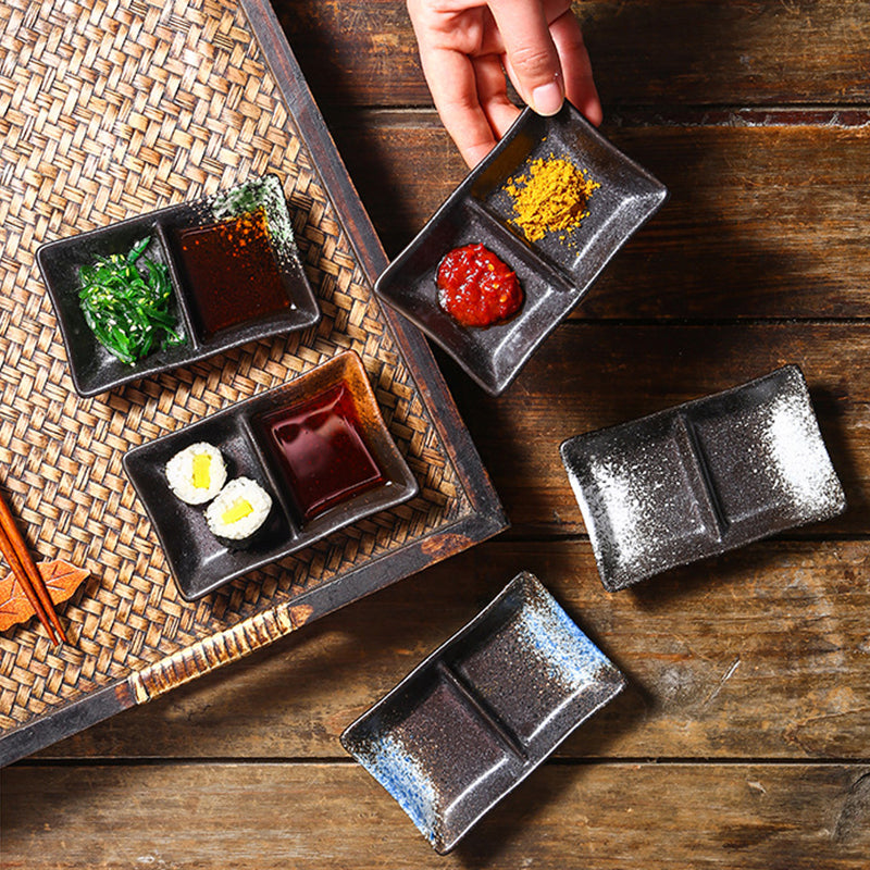 This elegant Japanese-style rectangular ceramic soy sauce dish is perfect for both restaurant and home use. Made from high-quality porcelain, it features a two-grid design, ideal for serving soy sauce, dipping sauces, or seasonings for sushi, Korean barbecue, and hot pot. Its sleek, divided structure ensures easy separation of sauces, making it a practical addition to your dining experience. Crafted from durable pottery, this versatile dish enhances both style and functionality in any setting.