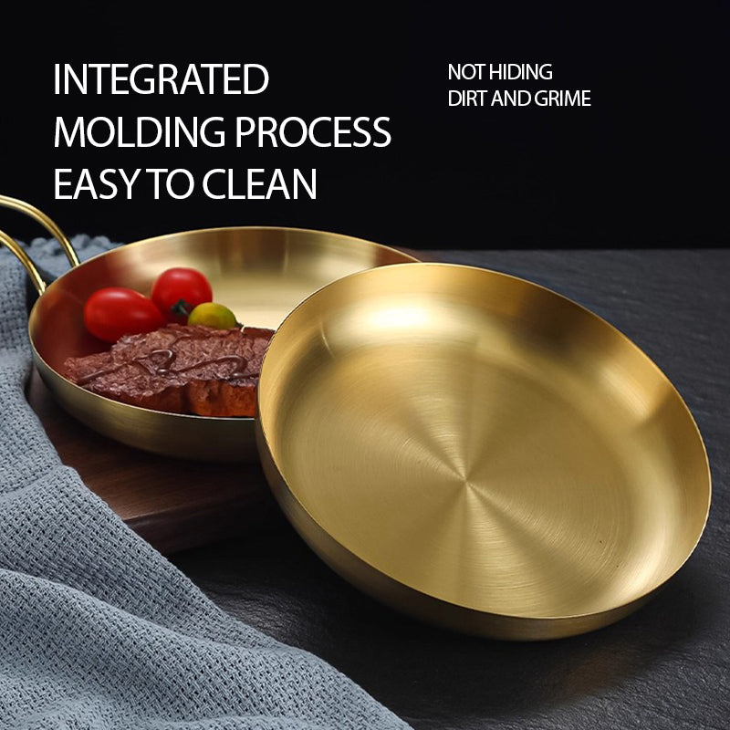 The Flat Grill Stainless Steel Snack Plate with Handle (Gold) combines functionality with elegance, making it a standout piece for serving food in both professional and home settings. Designed for Western restaurants, steakhouses, or home kitchens, this round plate boasts a luxurious gold-plated stainless steel finish that enhances the presentation of your dishes. The ergonomic handle allows for safe and comfortable carrying, even with hot food. Ideal for serving sizzling steaks, Korean BBQ, desserts, or snacks, it ensures both style and durability. This versatile, creative design adds sophistication to your table while maintaining high performance for daily use.
